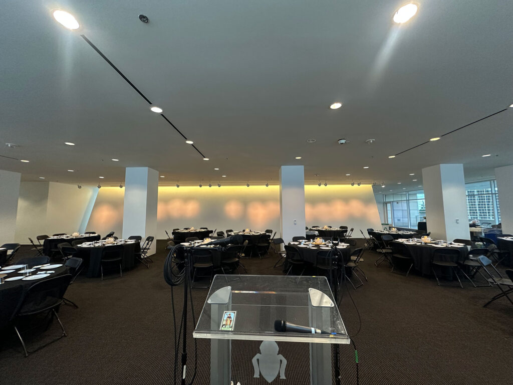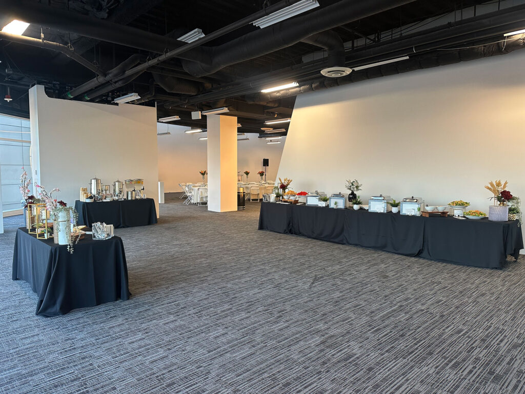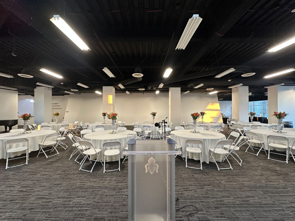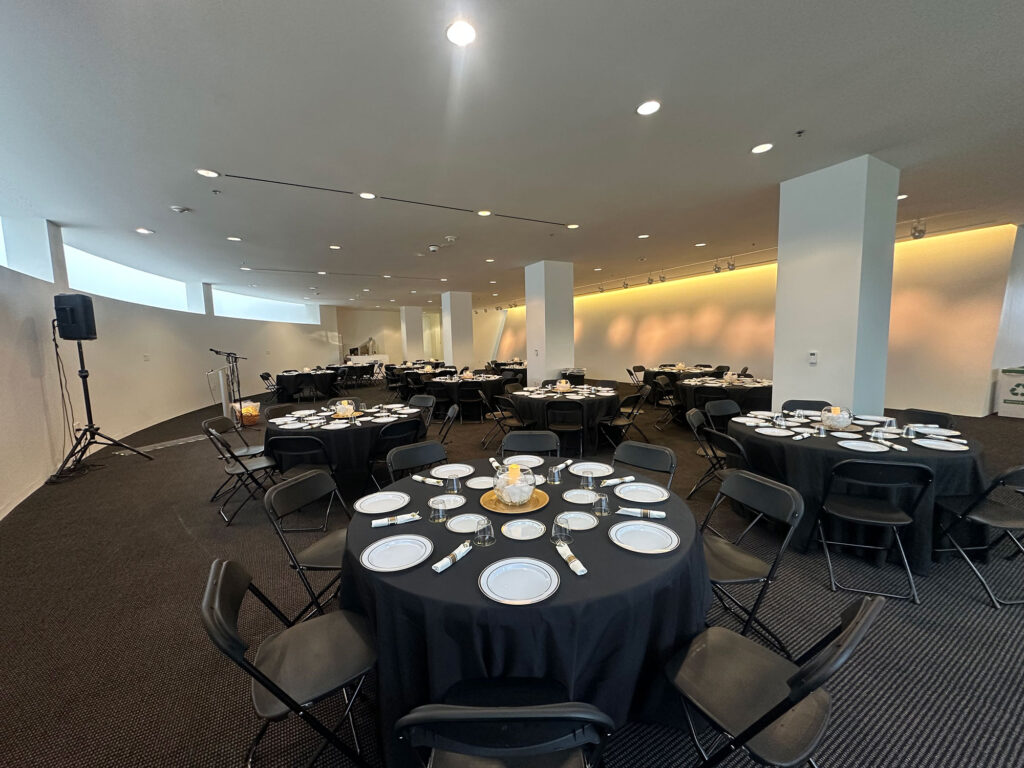 The 1st Floor lobby can comfortably accommodate up to 200-250 people with banquet-style seating.